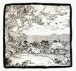 Piękna, unikatowa chusta jedwabna z graficznym pejzażem, Milanówek, Polska, wczesne lata 90. Chusta jest wykonana w 100% z ...