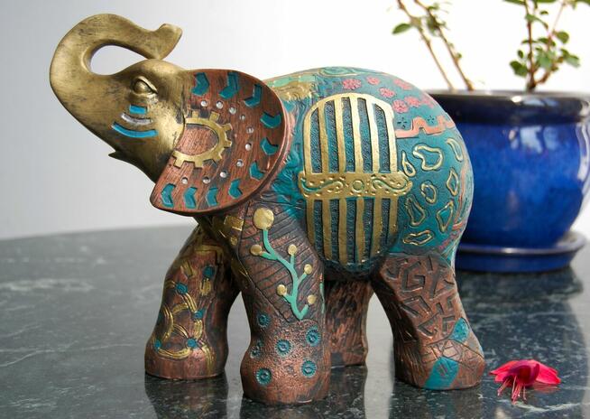 8Piękna, bogato zdobiona figurka słonia - rękodzieło z Egiptu. Słoń jest wykonany z żywicy syntetycznej, jego ...