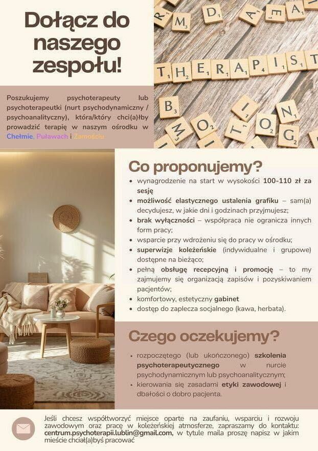 #PRACA Zapraszamy psychoterapeutów (również w trakcie szkolenia) do współpracy w miejscowościach: #Chełm #Puławy #Zamość <3Szukamy również terapeuty/tki uzależnień oraz psychodietetyczki w tych miastach :)
